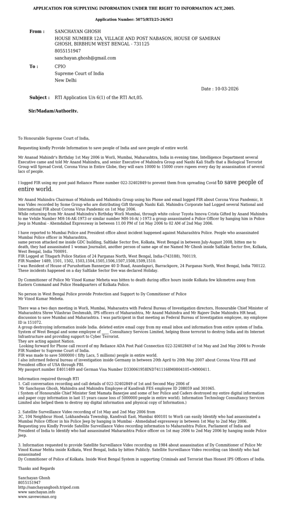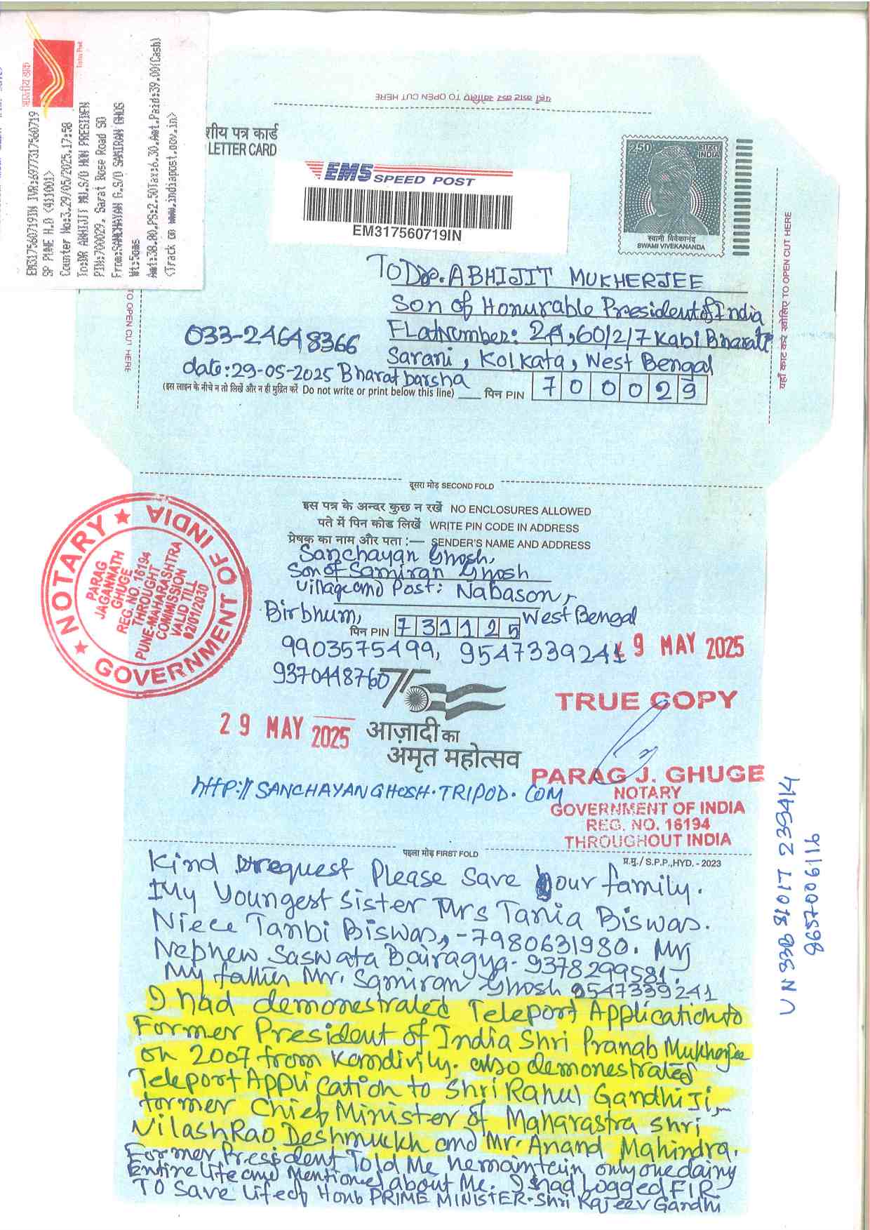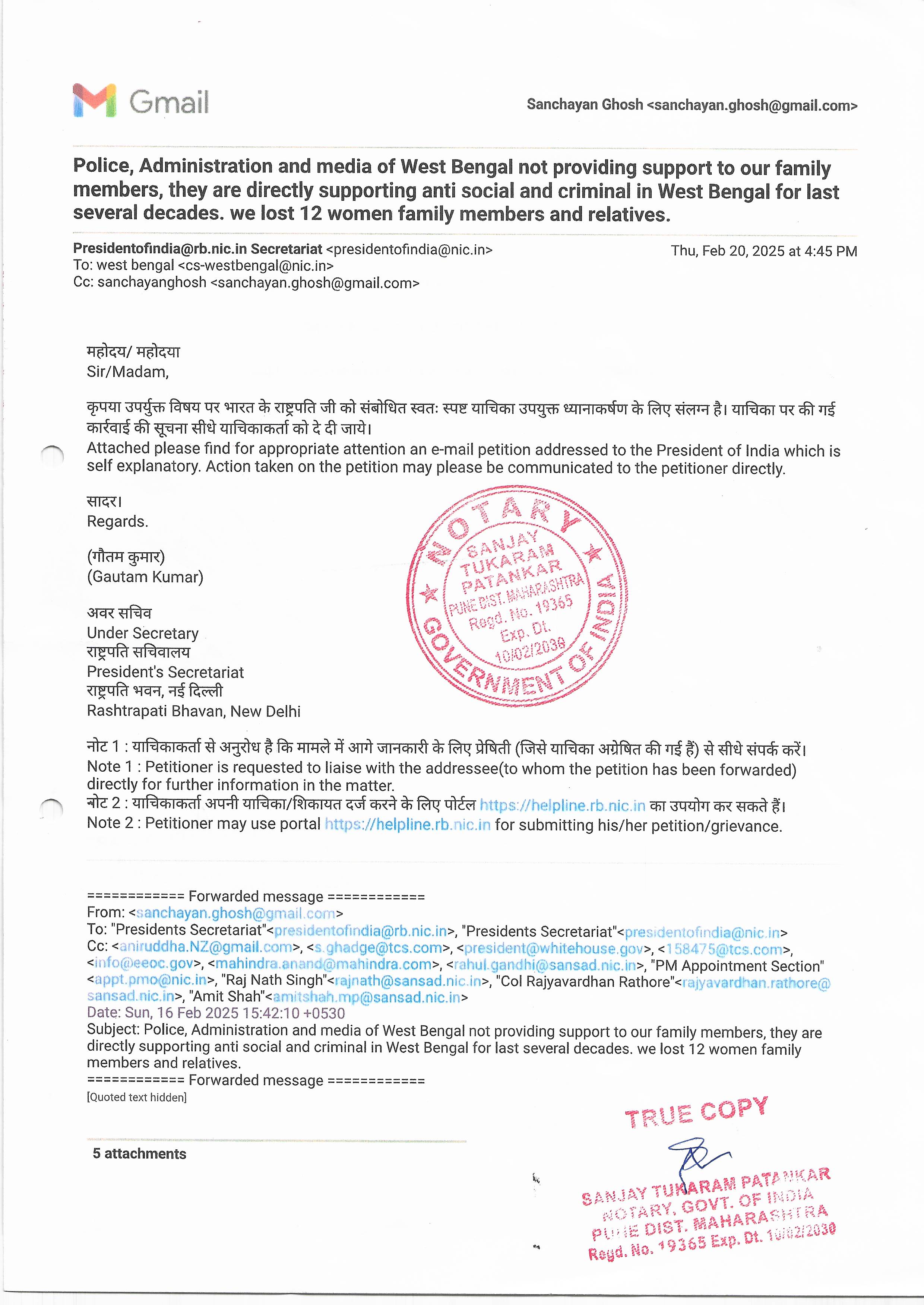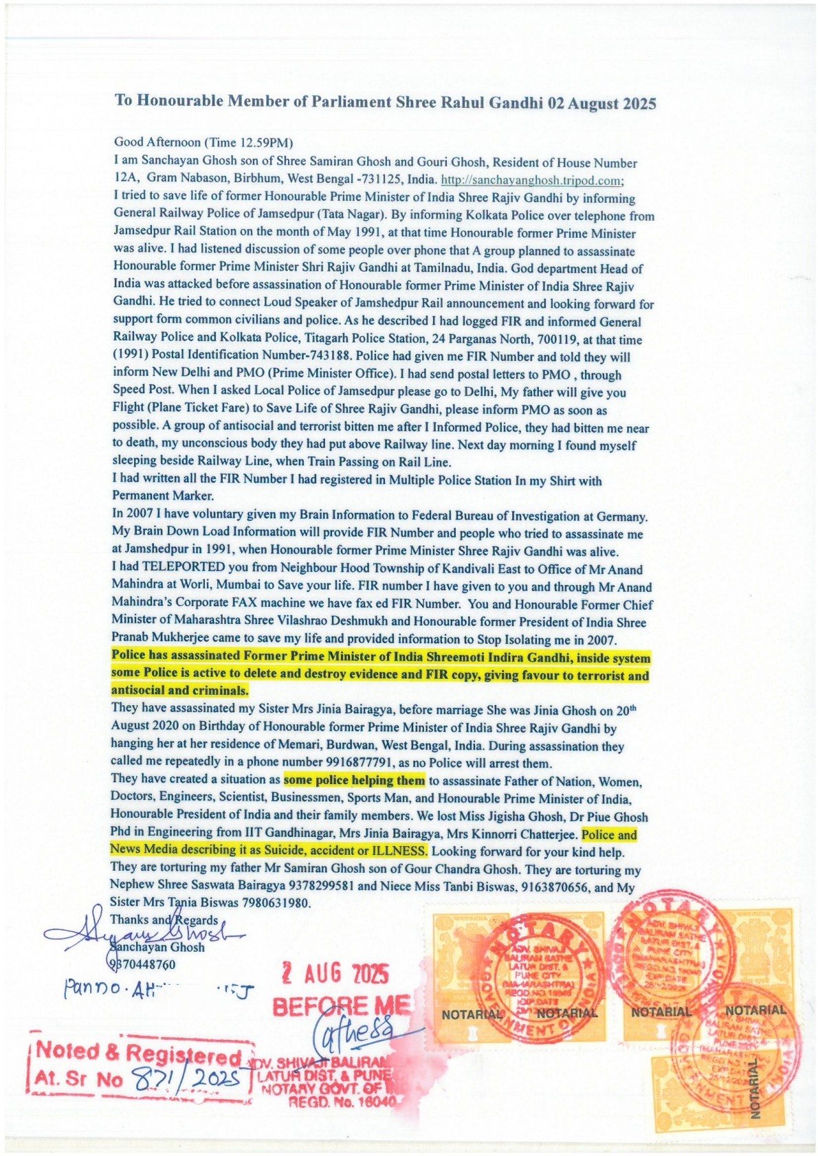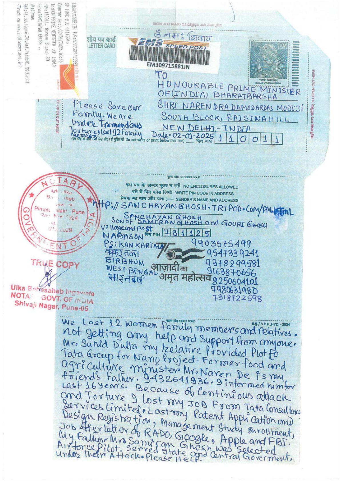 1. Conversation with Smt Maneka Gandhi ji, I tried to save Life of Honourable former Prime Minister Shree Rajiv Gandhi by Logging FIR from Jamshedpur in the month of May 1991, at that time I was School boy of Class 10. After informing Police and Logging FIR, a group bitten me and kept me on Rail Line to Die. Last 35 years I am regularly under attact and lost 13 family members and relatives, last 10 Years I am under hospital treatment, not getting any help from any where. Download Postal Letter RM224321226IN to Smt Maneka Gandhi ji