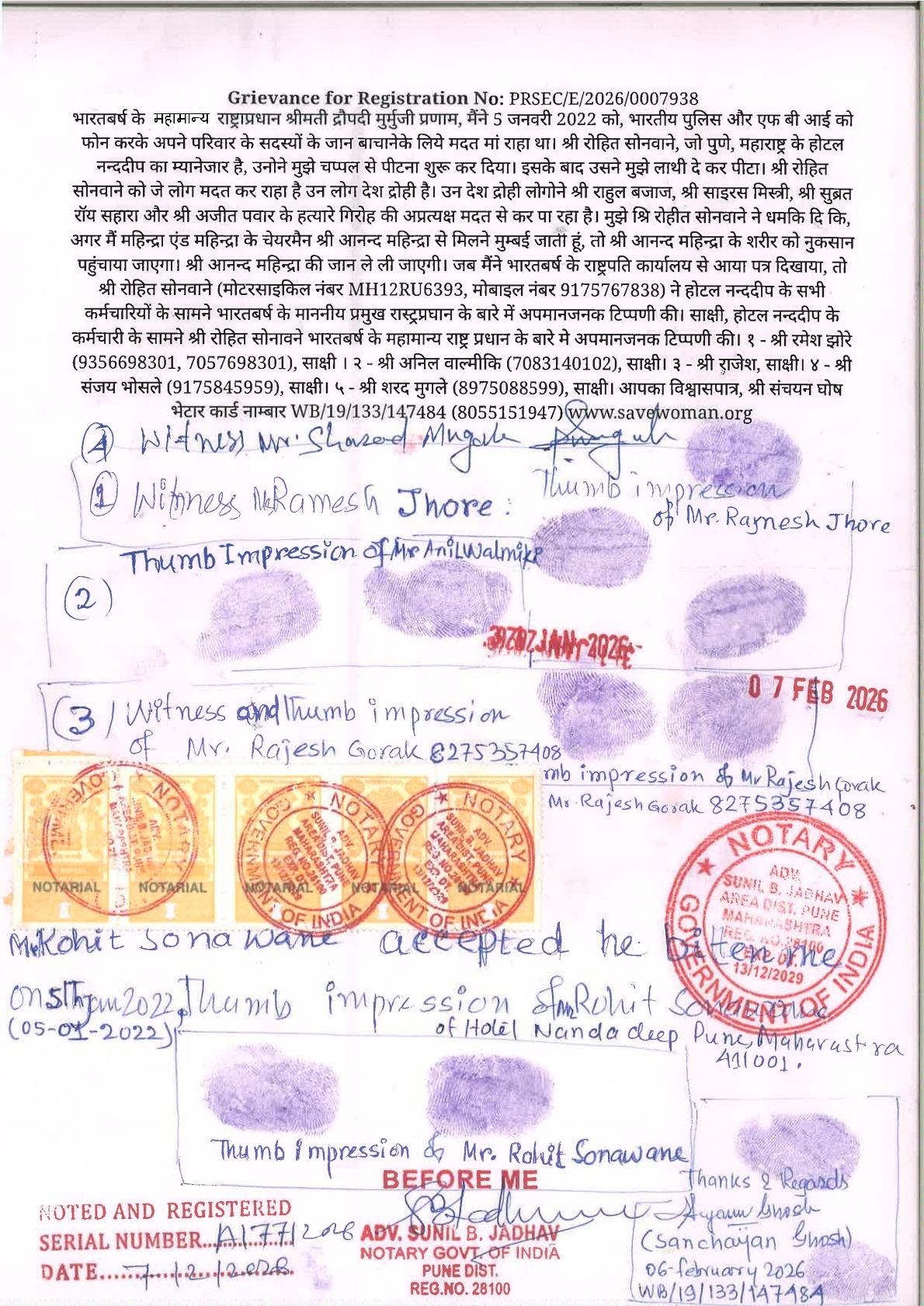 Mr Ramesh Anant Jhore Staff of Nandadeep Hotel, Pune, Maharashtra, India-411001, bitten me on 15th March 2026 and 14th April 2026. Witness Mr Anil Walmiki and Mr Rajesh.